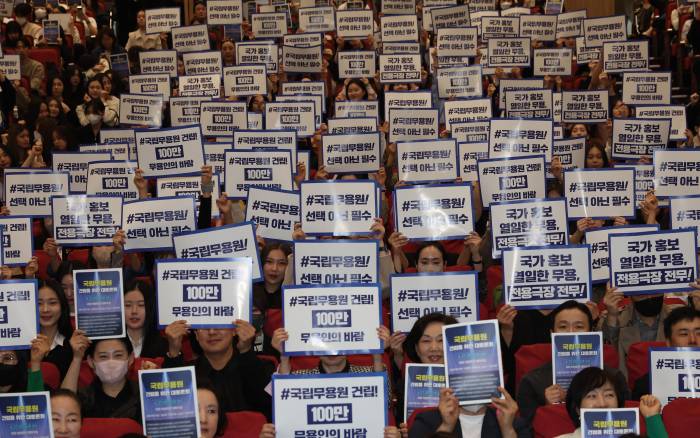 27일 오후 2시30분. 서울 여의도 국회 본관 앞에서 청년 무용인 수백여 명이 대거 참석했다. 저마다 손에 든 종이에는 “‘국립무용원! 선택 아닌 필수” “국가홍보 열일한 무용, 전용극장 전무” “국립무용원 건립 100만 무용인의 바람” 등 구호가 적혀 있다. 이날 MZ세대 청년 무용인과 스승뻘인 60~70대 무용인과 저마다 한 마음으로 국립무용원 건립을 위해 목소리를 높였다. 한 무용인은 “뜻깊은 결과를 기대하고 선후배의 조언에 따라 국회를 찾게 됐다”고 말했다.